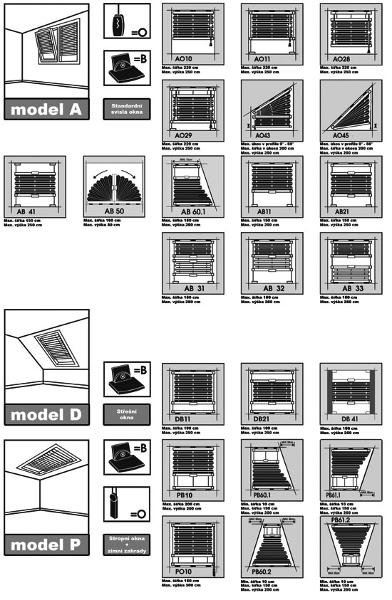 OVLÁDANIE: motor na diaľkové ovládanie (len pre AO 10, DB 11 a PB 10) + ovládač – 1-kanálový, 5-kanálový, 15-kanálový, 1-kanálový s funkciou časovanie, 5-kanálový s funkciou časovanie, 15-kanálový s funkciou časovanie