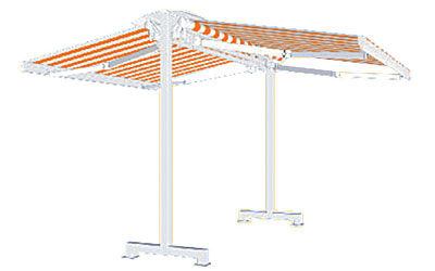Samostatne stojaca dvojitá výsuvná markíza vhodná pre zatienenie väčších plôch a komerčných priestorov. Maximálna šírka: 6000 mm / maximálny výsuv: 3000 mm